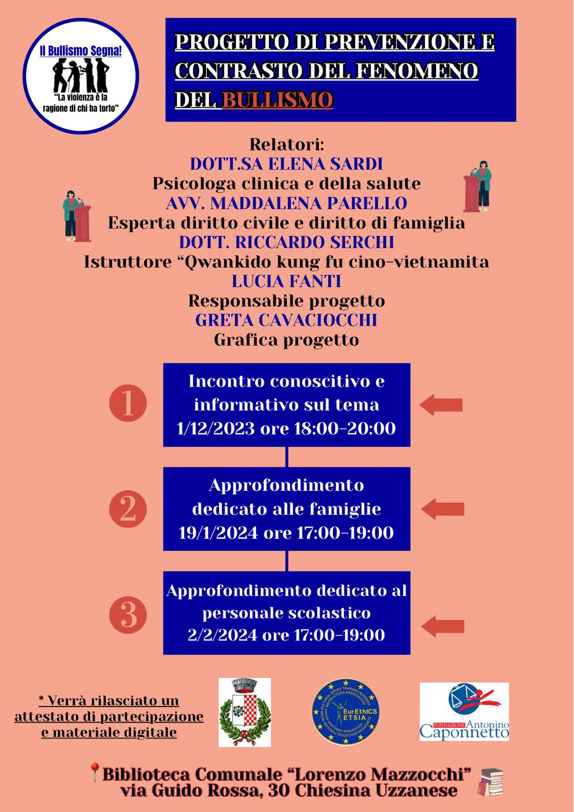 Il progetto " Il Bullismo segna !La violenza è la ragione di chi ha torto" viene presentato e dibattuto nei locali della Biblioteca Comunale di Chiesina Uzzanese via Guido Rossa 30 nelle date del 01 Dicembre 2023 , 19 Gennaio 2024 e 2 Febbraio 2024 .